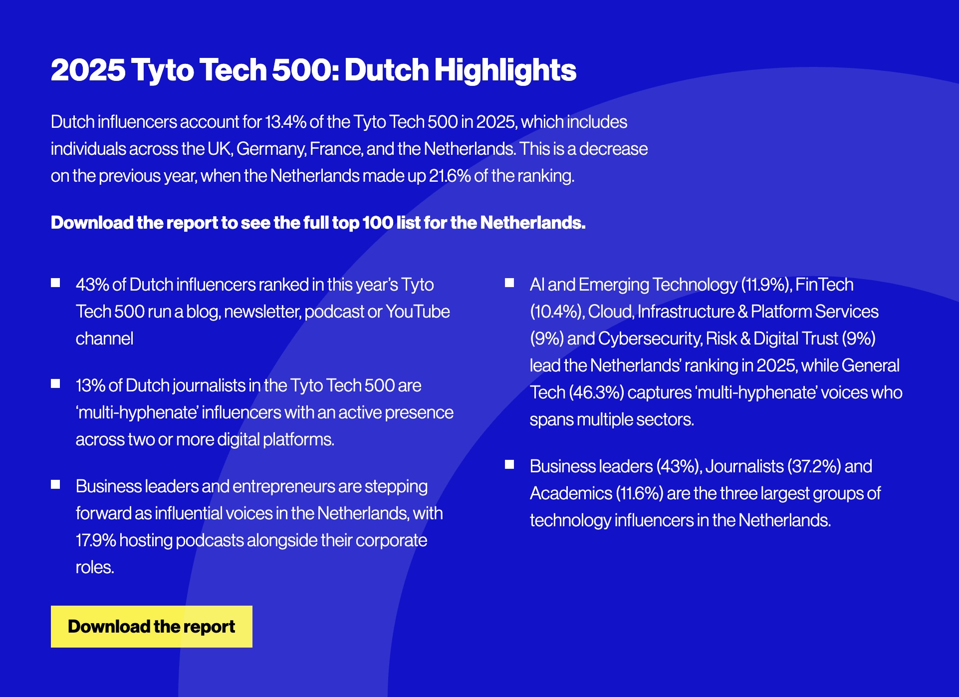 Nederlandse influencers zijn goed voor 13.4% van de totale Tyto Tech 500-lijst (die bestaat uit personen uit de UK, Duitsland, Frankrijk en Nederland).
